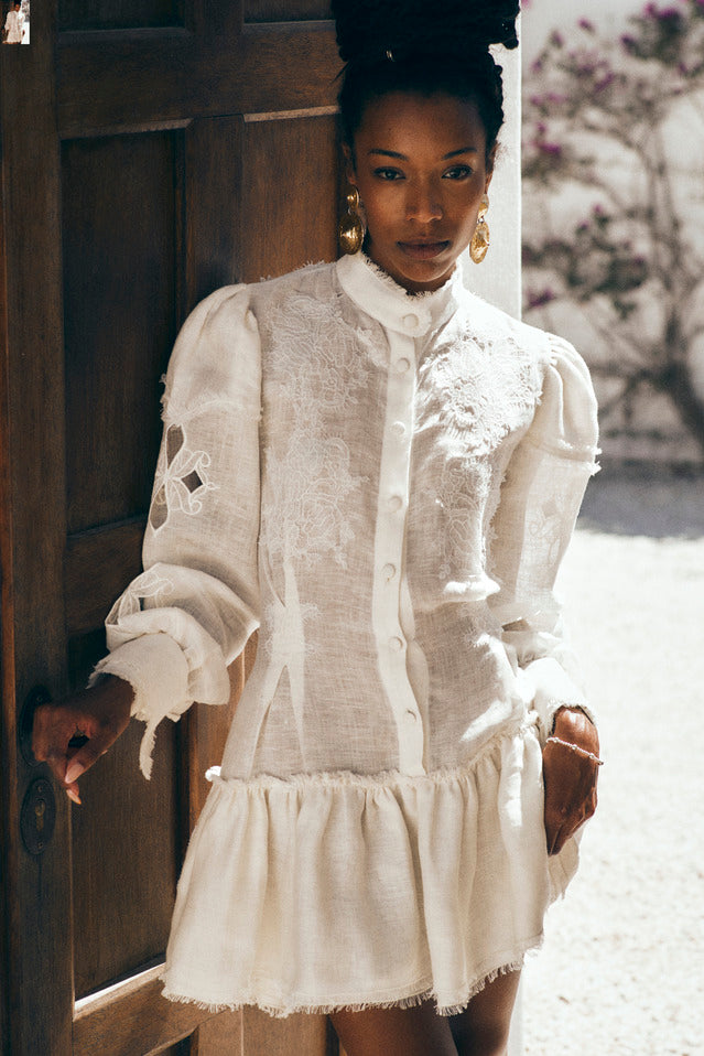 Regular price 505,00 EURWhite linen, front lace-embellishment, standing collar, long buffed sleeves with cutwork embroidery, front button fastening, button cuffs, slim fit, ruffled hem, open back, handmade fringed edge.